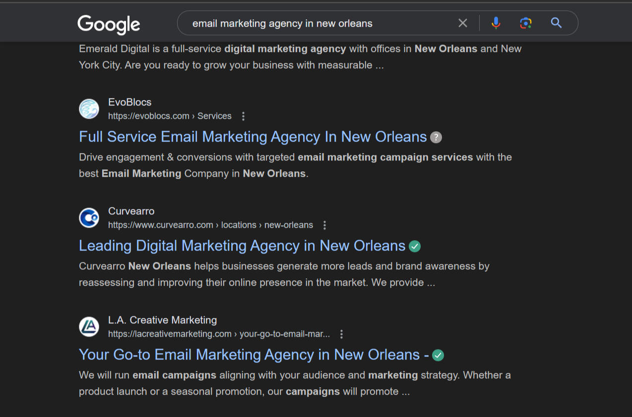 4. First page rank for an email marketing agency in New Orleans on a competitive local SEO keyword.Keyword: